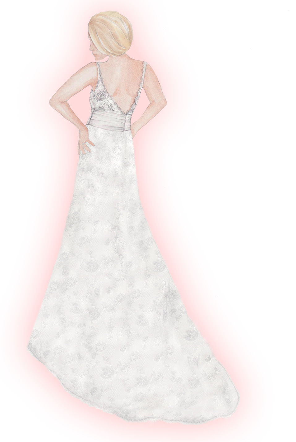 A V-neck A-line to showcase beautiful shoulders, collarbones, and décolleté. In re-embroidered alencon lace with a ruched waistband and 3-d floral detail.