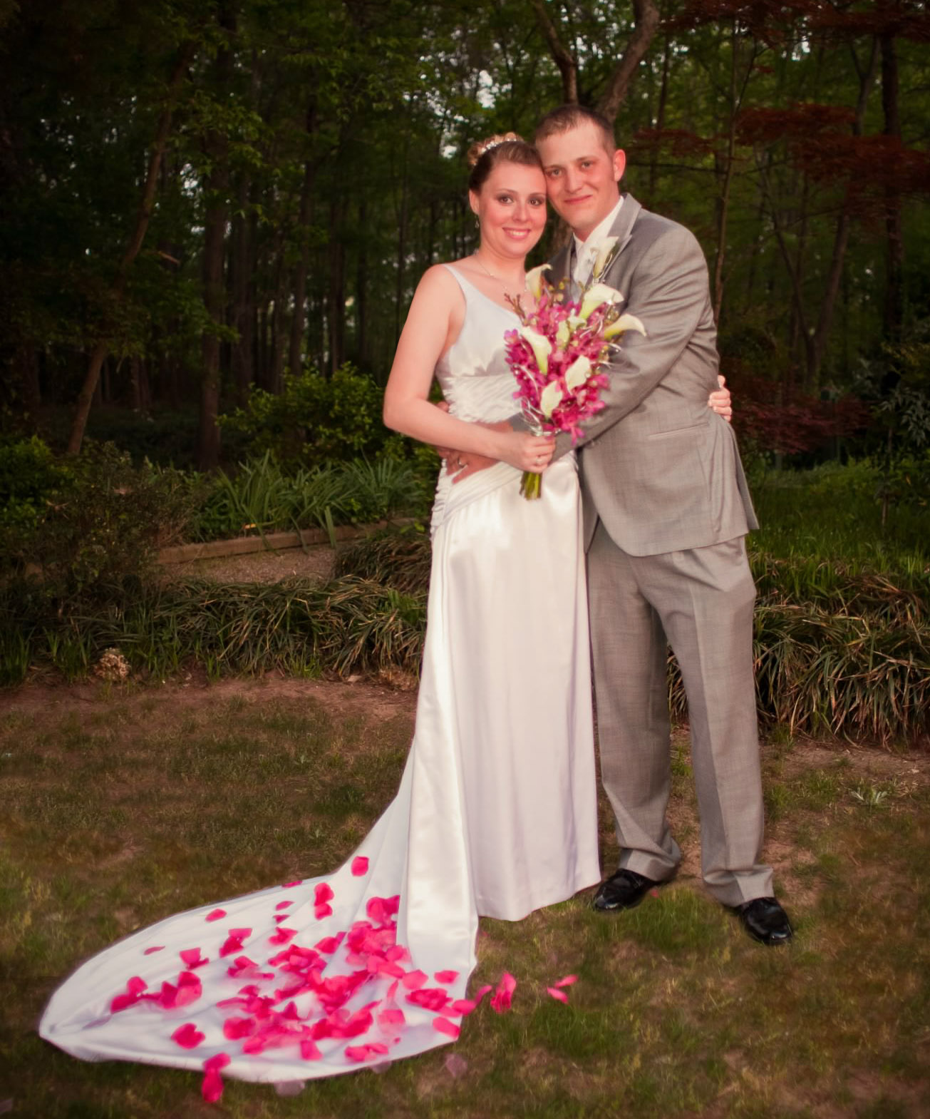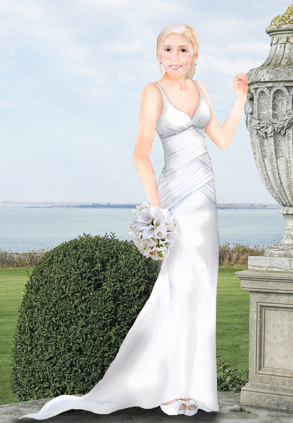 A glam, ruched charmeuse V-neck sheath with semi-cathedral train.