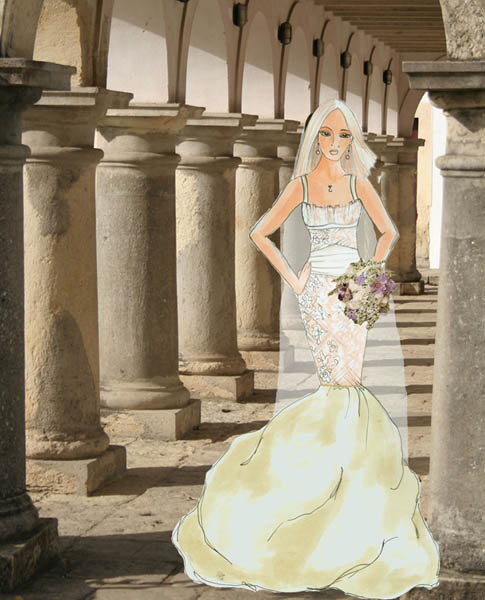 Alencon lace over nude underlay. Strap wraps under bust and leave back very open. Pleated lace on bodice. Style features three detachable skirts that attach with a metal separating zipper.