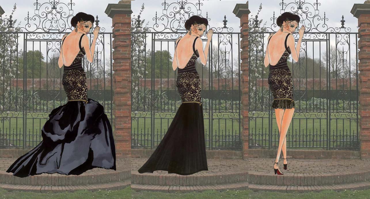 Gown available with one or all three detachable skirts.