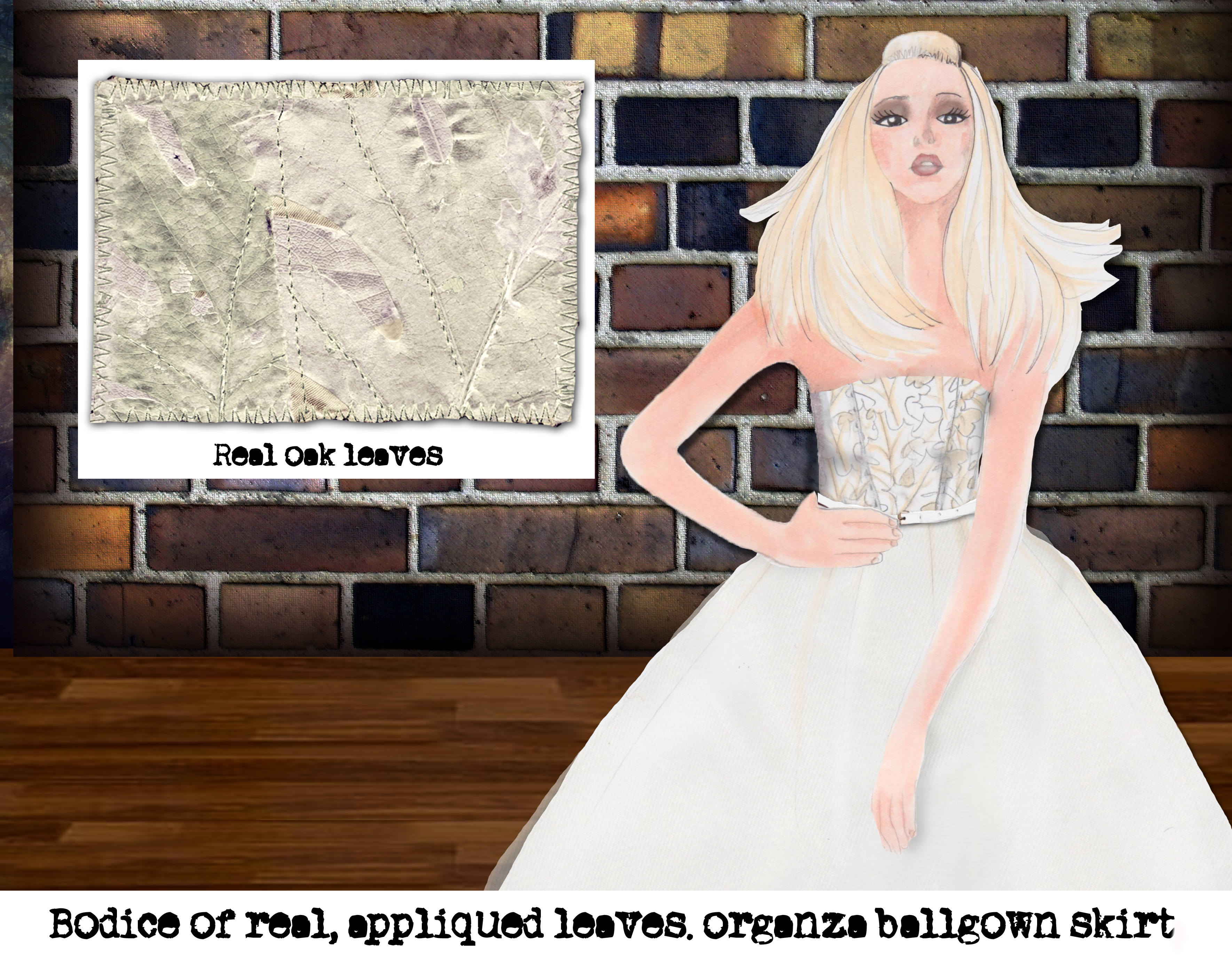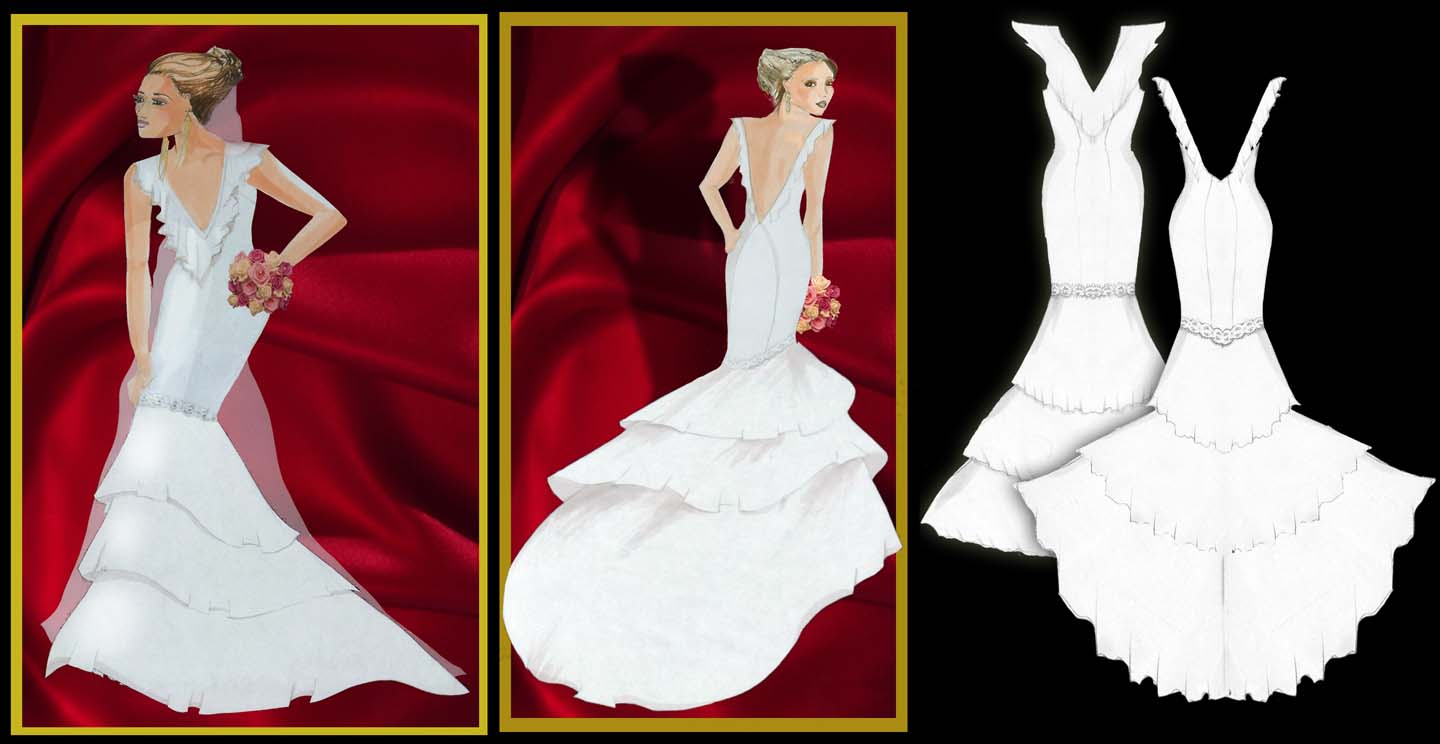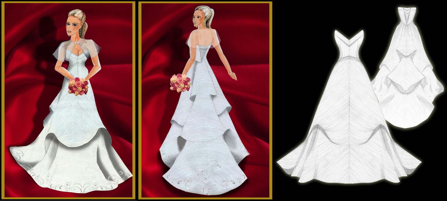 Alencon lace over nude underlay. Strap wraps under bust and leave back very open. Pleated lace on bodice. Style features three detachable skirts.