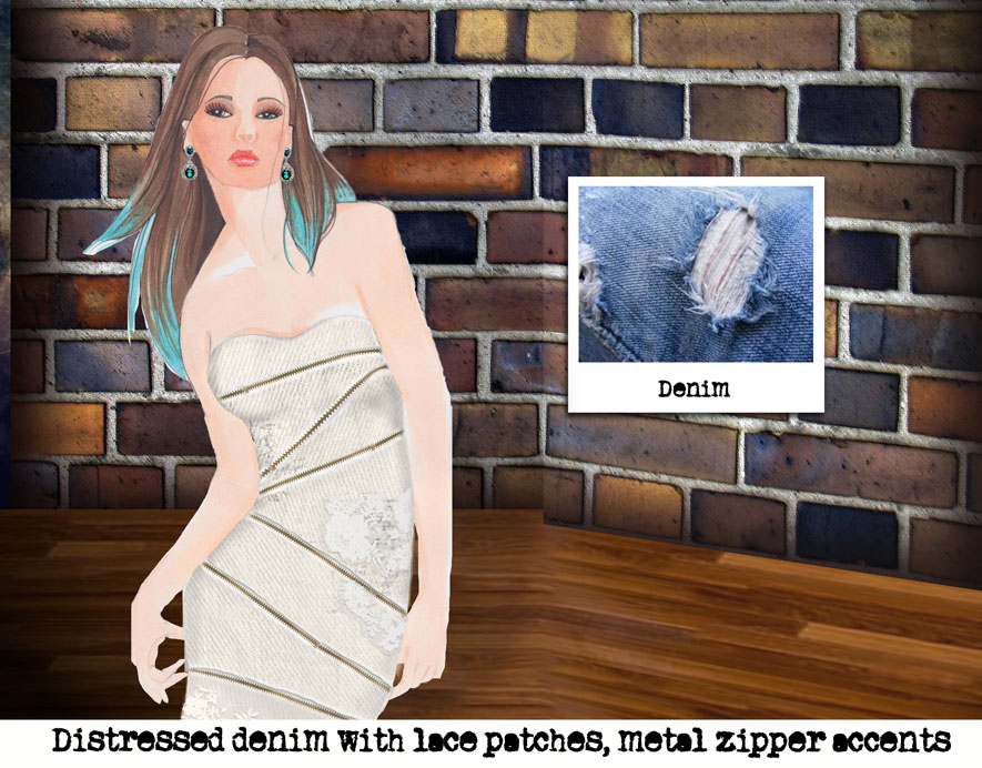 Silver lace strapless A-line with rhinestone embellishment on bodice, hem. Bodice lace will be chevron-pleated to visually angle waistline in. Chapel train.