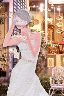Raw georgette/chiffon A-line skirt. Ruched bodice with sweetheart neckline, lace upper bust, ruched lower bust. Empire waist and V-back. Loops on back sides to lace a long, billowy chiffon drape tie.