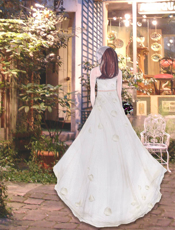 Delicate bias-pleated tulle overlays rose petals on a chantilly lace or organza. Contoured dip neckline with eyelash lace scallops. Velvet belt with rhinestone brooch.