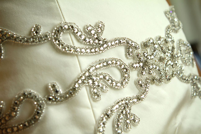 Lindsay's silk peau de soie (a luxe satin) mermaid features a beautifully-sculpted skirt, Swarovski embellishments, and a lace-up back.