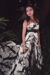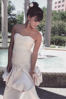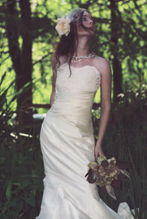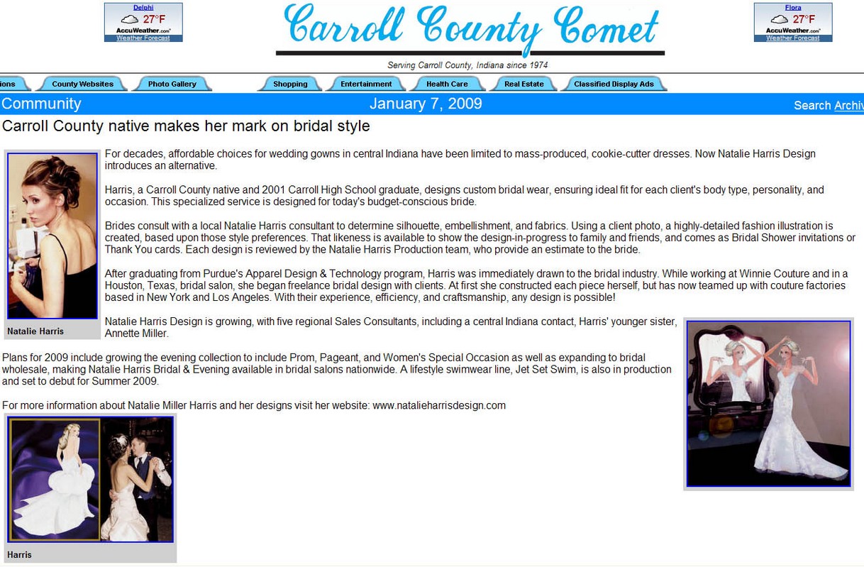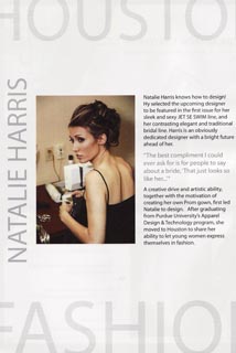 Text reads: "January" strapless print ballgown with real leaf sash, tulle godets, and lace-up back. Natalie Harris Bridal. Price Upon Request.