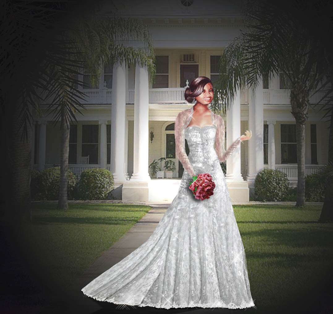 Silver lace strapless A-line with rhinestone embellishment on bodice, hem. Bodice lace will be chevron-pleated to visually angle waistline in. Chapel train.